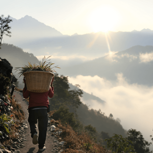 A las cinco de la mañana, cuando los primeros rayos de sol comienzan a aparecer sobre los picos nevados del Himalaya y los valles aún están cubiertos por una espesa niebla debido a la alta humedad, el recolector nepalí Mohan Bandhari emprende con cuidado un estrecho sendero de montaña. Cada movimiento requiere esfuerzo, pero sus pasos son seguros; al fin y al cabo, conoce este camino desde su infancia.